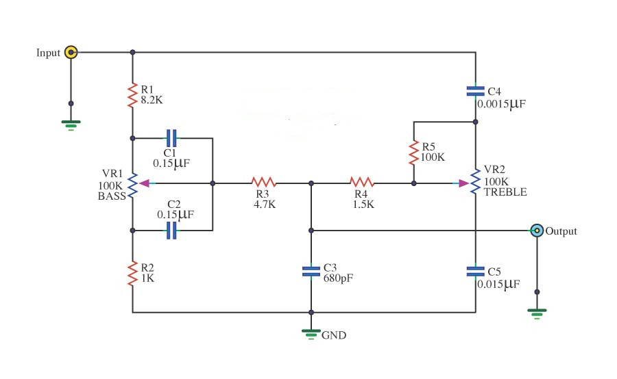 Cuando la entrada de alimentación vienen en señal de sonido que entra, se separa en dos, el camino por primera manera va a cambiar para llegar a una parte de filtros de baja frecuencia, por ejemplo, R1, C1, C2, R2. VR1 es la relación de expansión de manera fina de baja frecuencia, el sentido de la segunda señal, cambiará para llegar a una parte filtros de frecuencia alta, por ejemplo, C4, R5, C5 por haber formado VR2 da el valor de la alta frecuencia o triplicar una señal de que parten de un filtro de parte de frecuencia alta y baja cambio R3 y R4 se congregan luego salen aún de salida. Por tener C3 realizar erradicar el ruido se apaga.