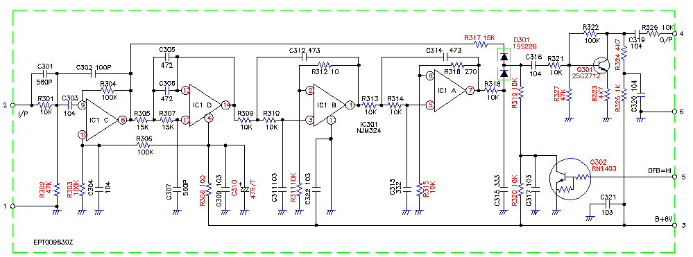 Este circuito de filtro de ruido de audio es un filtro de paso de banda para la banda de frecuencias de audio. Filtra las señales no deseadas que son menores o mayores que la frequencies.It audio tiene 2 filtros: un filtro de paso bajo y un filtro de paso alto de una cascada de filtros configuration.Both son filtros de segundo orden con una capacidad fiter / octava de 24 dB. El 3 dB de corte frec. son 11,8 Hz y 10,7 kHz. La característica de paso de banda se puede cambiar cambiando los valores de los condensadores y resistencias. Si desea elevar la frec de corte inferior., Debe reducir los valores de C1 hasta C4. Para bajar la frec de corte inferior. debe aumentar los valores. Si desea reducir la corte superior f debe aumentar los valores de R5 hasta R8 y disminuirlo con el fin de aumentar la frecuencia de corte superior. Ruido del esquema Filtro Lista de material: