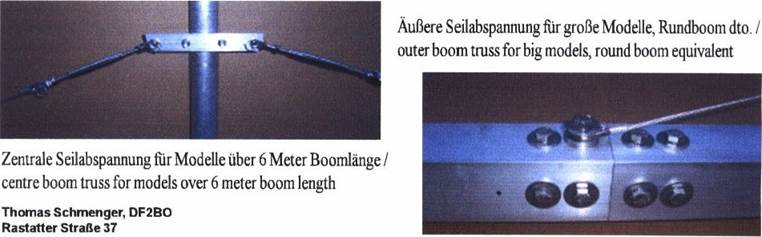 La pluma de la antena terminada, montada en el mástil, tiene que estar atada por dos cables de acero inoxidable de 4 mm de diámetro. En un lado se inserta una hebilla giratoria en cada cable de acero y en el otro un lazo metálico para la fijación en la pluma. Las cuerdas de acero deben insertarse con sus bucles metálicos en los tornillos interiores de las secciones exteriores de la pluma de 65 mm al montar la pluma. Hay que tener en cuenta que el cable de acero más corto debe fijarse en la parte trasera y el más largo en la parte delantera de la pluma.