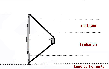 Si tenemos un parábola con el iluminador al centro de la parábola, la irradiacion es en linea recta al horizonte.