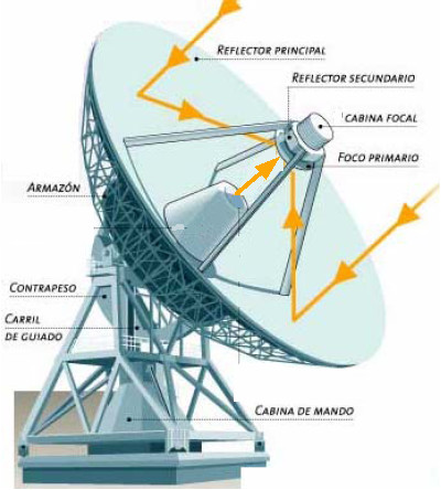 En las antenas receptoras el reflector parabólico se encarga de concentrar en su foco, donde se encuentra un detector, los rayos paralelos de las ondas incidentes.