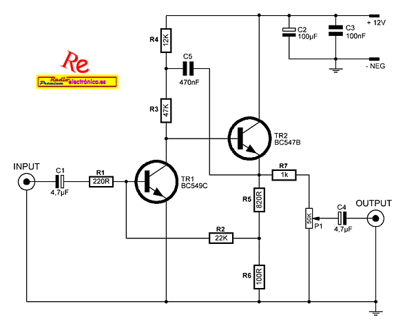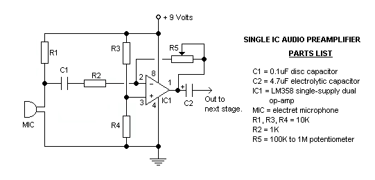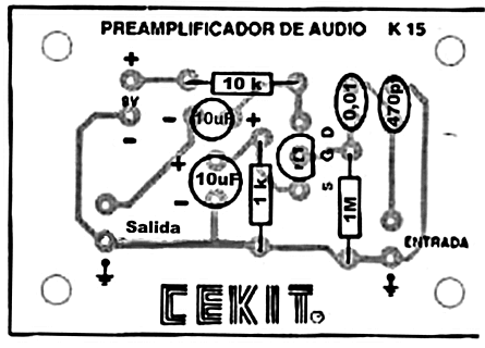 Con este circuito podrá amplificar la señal de audio débil proveniente de un micrófono y convertirla en señal apta para pasarla a otro preamplificador o directamente a una etapa de potencia.