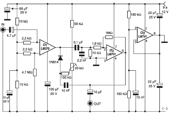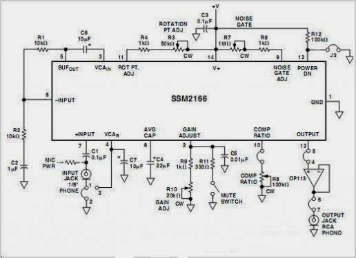 La entrada está protegida por un circuito interno que conduce el amplificador controlado por tensión (VCA). Un capacitor de 10uF (C6) se utiliza para acoplar el búfer para el VCA. La salida de VCA es de baja impedancia y capaz de conducir 5 k ohm cargas mayores a 1 v rms.