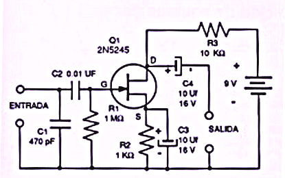 Funcionamiento lleva incorporado un transistor FET 2N5245 ó el 2N3819 conectado en configuración de fuente común, la señal proveniente del micrófono llega al C2 de 0,01 µf (10n), hacia la puerta de FET (g), los otros dos componentes asociados C1 y R1 ajusta la impedancia de entrada y fijan el voltaje para la compuerta del drenador (g) , el condensador C4 de 10µF se utiliza para acoplar la señal de corriente alterna ya amplificada a la segunda etapa y además bloque el voltaje de corriente continua presente en el Drenador. El condensador C3 de 10 µf establece una ganancia alta para señales de corriente alterna.