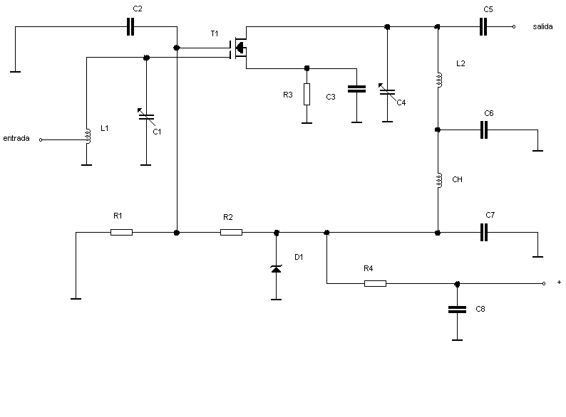Este circuito utiliza un transistor tipo 2SC2498 , el cual es un transistor MOS de efecto de campo (FET) de doble compuerta aislada protegida. Se eligió este transistor porque tiene una elevada ganancia hasta los 400 Mhz aproximadamente, lo cual lo hace apto para funcionar en 10-11 metros. Este FET trabaja en configuración de fuente común con polarización fija de compuerta 2 y entrada de señal por compuerta 1. Este tipo de configuración es excelente para conseguir alta ganancia con buena estabilidad. R3 da la polarización de fuente para que el transistor funcione correctamente; C3 desacopla a R3 para la corriente alterna. D1 mantiene la tensión de alimentación del circuito estabilizada, ante cualquier variación de la tensión que proviene de la fuente de alimentación.