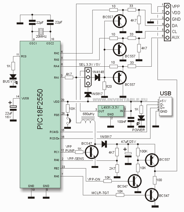Este circuito, esta basado en el modelo del PicKit2® de la Microchip® y aprovechando la idea de Suky para poder trabajar también con micros de 3,3V. En mi caso he optado por usar un regulador específico en lugar del sistema con componentes discretos pensado por Suky.