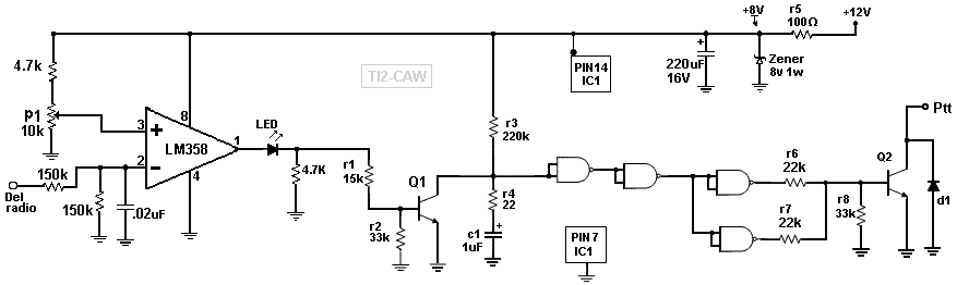 P1 es una resistencia variable o potenciómetro común donde se ajusta el voltaje de corte del circuito integrado. La forma en que esta conectada la entrada (que dice: Del radio) es para conectarse en un punto positivo que se pase a tierra (negativo) en presencia de señal ("squelch" abierto) o tarjeta de tonos. Si lo que tenemos es un punto que se pase a positivo con la señal debemos intercambiar los pines 2 y 3 del circuito integrado operacional.