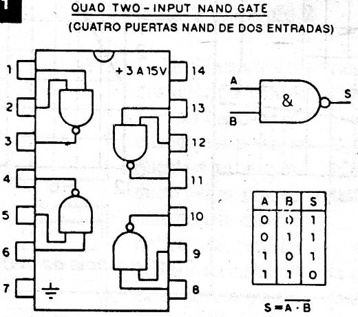 Utilizamos compuertas lógicas NAND, un circuito integrado NTE4011 trae las cuatro que necesitamos, como en realidad se utilizan como inversores también funcionan compuertas tipo NOR (NTE4001).