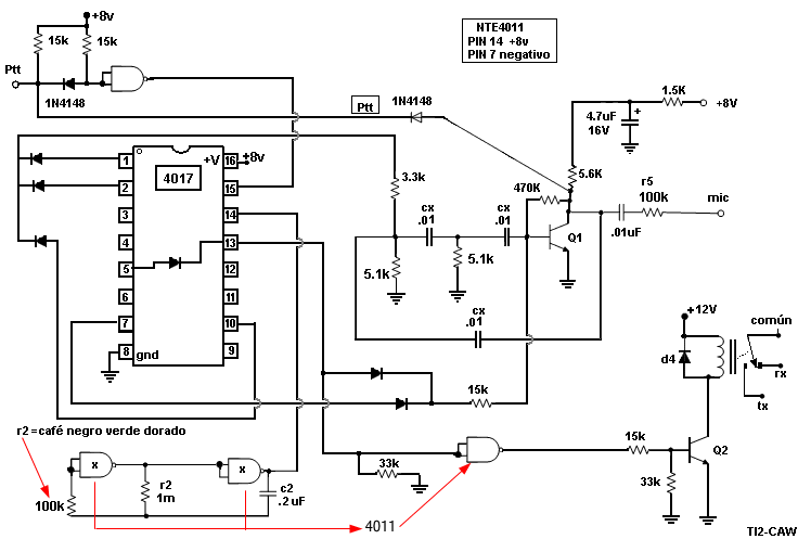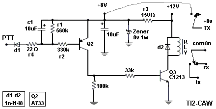 Cuando el radio no tiene un punto donde tengamos 8v en transmisión podemos usar un relay con doble fila de contactos para alimentar el oscilador de audio (+8v TX).