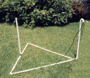 Luego con los tres tramos concluidos tomar un triangulo que por lado queda 1,90 Cm en solo dos puntos extremos de este aplicar soldadura, de este modo queda formado él triangulo. Todo este triangulo se introduce en la manguera plástica de mas de ¼ para que quepan fácilmente las bobinas. En el extremo no aislado se suelda la cinta plana de 300 Homs de impedancia que sirve para cargar la antena, se debe tener cuidado de no separar demasiados los extremos de los elementos ni de pelar mucho la cinta plata de 300 Homs para evitar variar la impedancia características. En Donde se soldó la cinta y quedan los extremos de la manguera se suelda con brea u otro material, con el fin de conseguir una unidad hermética para evitar la humedad.