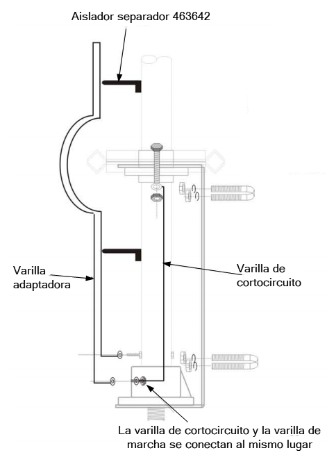 Conecte los dos aislantes de soporte de varilla al conjunto de la base utilizando los dos tornillos de cabeza phillips. Utilice los dos hales preperforados en la base lejos de la ubicación de montaje. Fije la varilla correspondiente a la base como se muestra . Las dos varillas deben correr paralelas entre sí. La varilla matching no debe tocar el soporte radial en ninguna parte de la antena, excepto los dos puntos en la parte inferior donde i t está atornillado al po i nt de alimentación y al radiador.