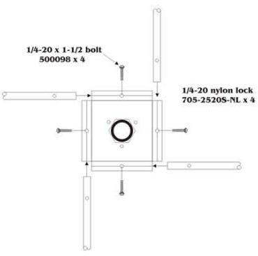 lnstall los cuatro tubos de 5/8" que tienen el hale a 2 pulgadas del extremo large. Alinee el hale con el soporte e inserte el perno 1/4-20. Después de insertar los pernos ali, puede instalar las tuercas de bloqueo de nylon tour y apretarlas todas, incluidas las tres tuercas del aislante.