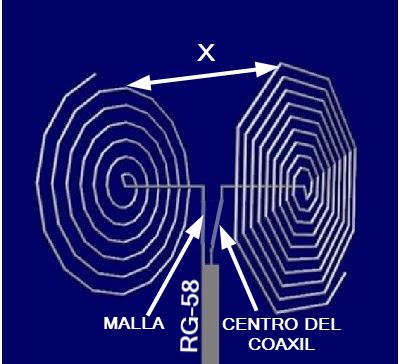 Es una disposición única de un dipolo simple donde las secciones de cuartos de onda se enrollan en espirales planos en lugar de ser dispuestos en línea recta. La transmisor de la antena, es horizontal. La ventaja de esta configuración se encuentra principalmente en su tamaño compacto. La antena terminada se ajusta fácilmente a una altura de 2 metros.