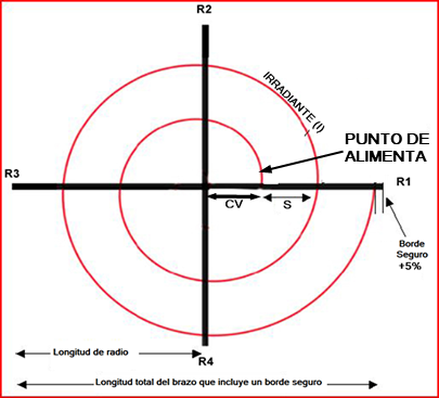 El punto de alimentación convendría poner una caja con un conector hembra coaxial, para que no le entre agua al cable coaxil. La alimentación hacia los irradiantes, se han puesto dos terminales, pero también podremos poner una union dentro de la caja y sacar de ahí la alimentación a la antena. Los cables de alimentación a los irradiantes, son de un diámetro entre 2 y 4 mm Estos cables nos proporcionaran una impedancia de 75Ω y el cable coaxil de alimentación es de 50Ω; así que no precisaremos poner balun para adaptación. El punto de alimentación en el irradiante, debe de ser móvil, esto es por que tendremos que ajustar la ROE después de montarla. Vea en la imagen, que se detalla donde irán los puntos de alimentación en cada lado.