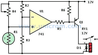 Cuando la temperatura sube, el valor del termistor R1 disminuye, disminuyendo el voltaje en sus terminales y causando con ésto que el voltaje en el terminal no inversor sea menor de 6 voltios. Esta situación hace que la salida del comparador pase a nivel bajo (cerca de 0 voltios), sature el transistor Q1 y active el relé, que a su ves da la señal de alarma.
