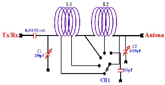 El transmach, esta diseñado para las bandas de radio-aficionados, se recomienda, aunque no aparece en el circuito, colocar a la salida un choque de radio frecuencia de 2,5 mH. El choque deberá de ser instalado entre la salida ( antena ), y masa. Las bobinas convendrían que estuvieran desfasadas 90º una de la otra y la caja para el montaje es de metal puesta a tierra. De esta manera podremos evitar que las armónicas lleguen a la antena. Hay que recordar que un transmach, no elimina la ROE de la antena, por cierto la ROE continua estando ahí, lo único que esto hace es adaptar la impedancia de la antena ( que puede estar comprendida entre 40 y 350 ohms ), y el radio ( ya todos sabemos que esta es de 50 ohms ). El circuito: L1 = Son 12 espiras de alambre Nº 18 ( 1,5 mm aprox. ), bobinando 8 espiras cada una pulgada ( 2,54 cms ); se deben de sacar derivaciones para las distintas bandas. La derivación para 10 Mts, es en la tercera espira, para 15 Mts, es en la sexta espira y toda la bobina para 20 Mts. L2 = Son 21 espiras de alambre Nº 20 ( 1 mm aprox. ), bobinando 16 espiras cada una pulgada ( 2,54 cms ); las derivación es en la novena espira para 40 Mts, y toda la bobina para 80 Mts. C1 y C2 = Son condensadores variables de aire, del tipo radio, utilizando solo un cuerpo para C1 y tres cuerpos de 365 pF cada uno, para C2. El condensador de entrada, se puede conseguir en televisores a válvula, es de 0,001 a 2 Kvolt. La llave, convendría que fuera del tipo porcelana para evitar perdidas, pero si no se consigue puede usar la que tenga, las perdidas con otro tipo de llave es mínima. La construcción es bien sencilla y fácil de realizar, además nos dará buenos resultados en aquellas antenas que instalamos provisorias. Espero que les sea de utilidad este circuito. |