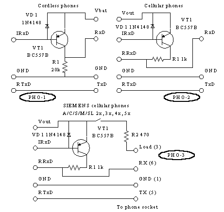 El conector de los teléfonos celulares pueden ser utilizados para la aplicación de los comandos AT-o sustitución del firmware. No hay control de flujo por hardware de circuitos en el conector. El Siemens se muestra conector específico. Utilícelo para comandos AT-con el interruptor apagado, para descargar el firmware con el interruptor encendido. El Siemens teléfono, conexión de pines es www.pinouts.ru. Para obtener más información, favor de buscar sitios específicos de teléfonos celulares.