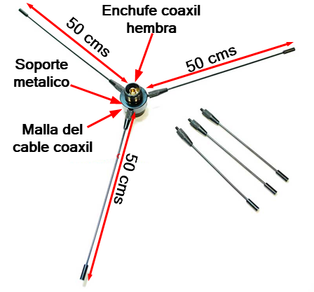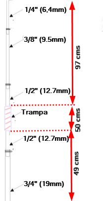 La varilla inferior es la parte de UHF y es donde se deberá de conectar el vivo del cable coaxial, su longitud es de 49cm, pudiéndose usar tubos de cobre o aluminio finos, la parte superior de 97cm y corresponde a la parte de VHF.