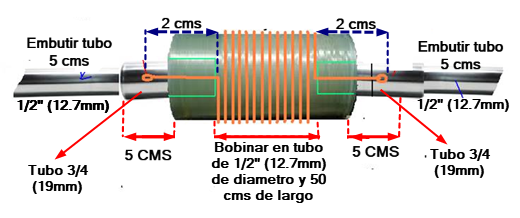 La bobina esta construida sobre un material aislante (tubo de PVC, resina, fibra de vidrio, etc.), de 1/2" (12.7mm) de diámetro y 50 cm de longitud. Se deberá de poner un material aislante y que tenga resistencia al viento.